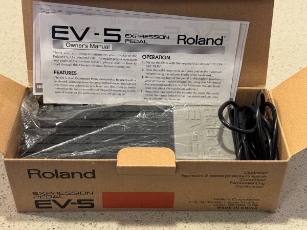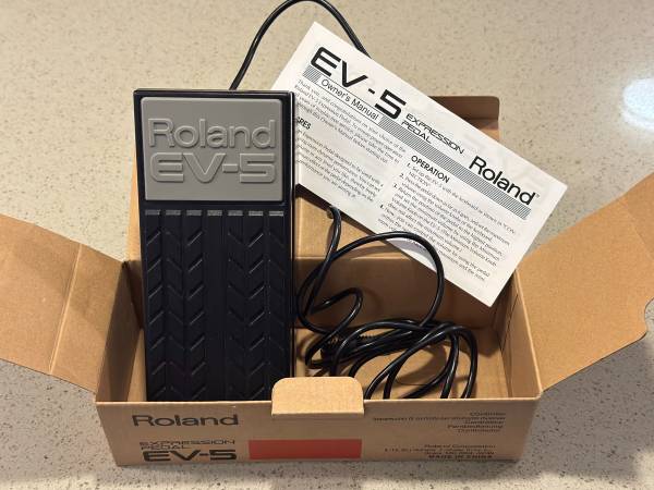 Used, like new, original owner, never gigged. Roland EV-5 is a compact expression pedal for controlling real-time parameters on compatible electronic musical instruments like keyboards, synthesizers, and effect pedals. It features a minimum volume knob for setting a lower limit to the expression range and is connected via a permanently attached 2-meter cable with a 6.3mm stereo jack. While its plastic construction can feel inexpensive, it is known for durability and reliability, and is widely used for applications such as creating wah effects or controlling delays.