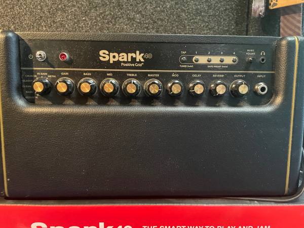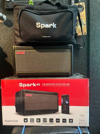 Near mint Positive Grid Spark 40 modeling amp. Comes in original box. Includes power supply (not pictured, but it's there) Comes with carry bag. Near Mint because I somehow managed to nick the tolex near the bottom on the side. See pics. Works great. Recently used it for acoustic guitar at a Bat Mitzvah. Plenty loud enough and sounded great. Get settings off the internet or create your own. Pick up in Inwood or possibly meet somewhere. Comes with soft carry bag specifically made for it. Take it with you anywhere.