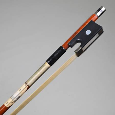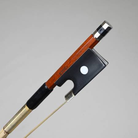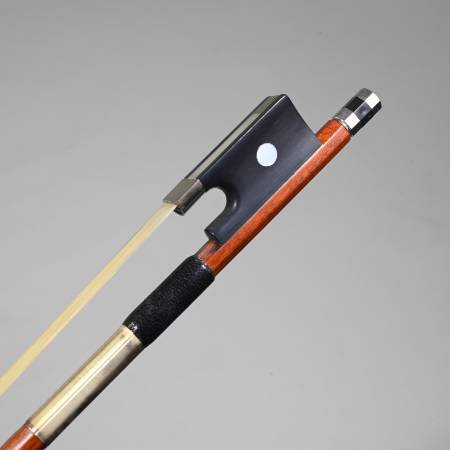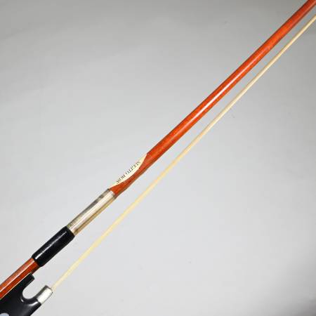 High quality bow by Sugito handcrafted in Japan. Round stick made from beautiful, select Pernambuco wood of bright terracotta color. Ebony frog with full nickel mount and large single eye.