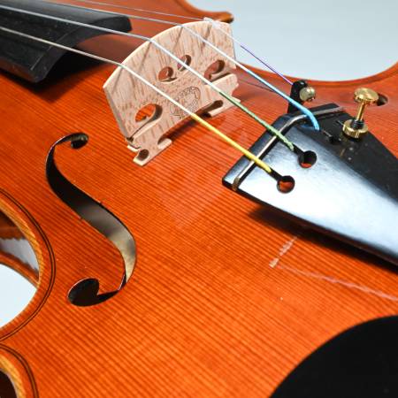 The violin is defect-free - there are no cracks, repairs, seam separations, or any other issues. There is a minor scratch from the string adjuster under the tailpiece, otherwise in perfect condition cosmetically. Equipped with a brand new set of Thomastik-Infeld Dominant strings.