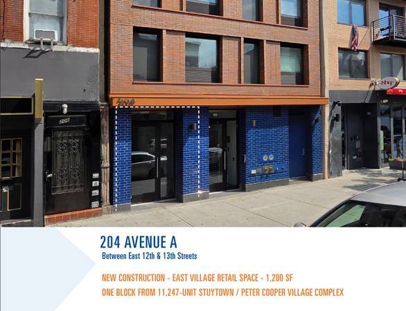 Brand new retail storefront available for lease in the heart of the East Village. Located on Avenue A between East 12th and 13th Streets, just one block from Stuytown/Peter Cooper Village and the 1st Ave L train station.