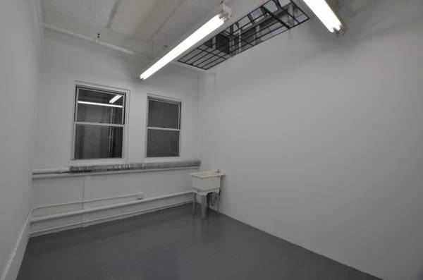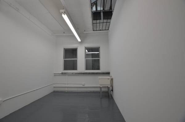This space features two windows facing a lit light well with decorative greenery, a shared skylight and one slop sink inside.