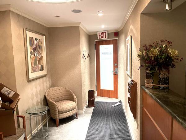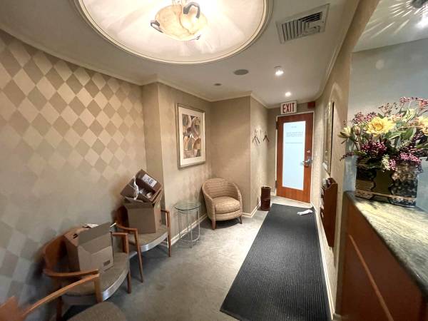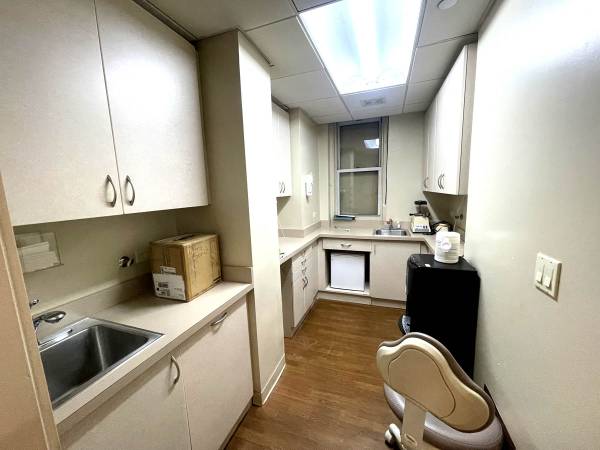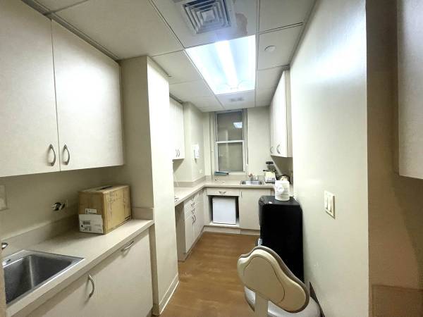 3 dental chairs, waiting and reception area, office, sterilization area, private bathroom, storage.