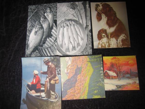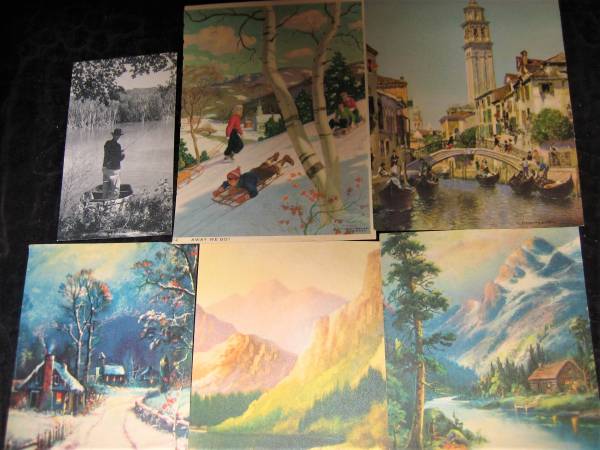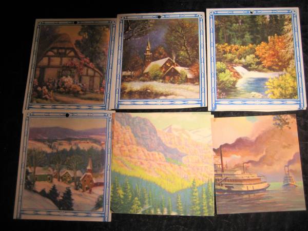 These rare art print calendar pictures were issued circa 1948 and are about 75 years old. The calendar prints size varies by picture but generally, are about 4.5" by 3.5". Each set of 6 pictures sells for $30.