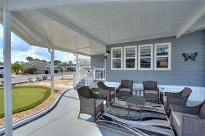Mostly Furnished with Many Updates, this Move-In-Ready 2 Bedroom/ 2 Bath Park Model on OWNED Corner Lot with 3-hole Putting Green and Covered Carport/Entertainment Area is located 1 block from the Community Pool and Clubhouse. Transferable Choice Home Warranty through 2/17/2027. Updated eat-in kitchen has white cabinetry, stainless-steel kitchen appliances and tile backsplash. Water heater replaced 2025; Plumbing updated 2025; HVAC replaced 2023; Comfort Cover Systems roof replaced 2015 with 15 year warranty ($250 charge to new homeowner to transfer warranty). Many replacement windows with blinds, newer ceiling fans and solid surface floors throughout. Cedar closet in primary bedroom. Pocket doors maximize interior space. Attached storage shed with shelving plus 2 locking exterior storage units. Low monthly HOA fee includes water, trash pick up and lawn care. Mockingbird Ridge is a 55+ golf cart friendly community.