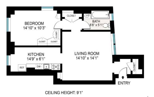 As the most expansive layout in the building, the rarely available E-line offers triple exposures through the North, South, and West facing windows of this ninth floor apartment.