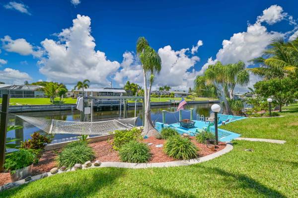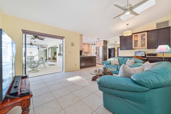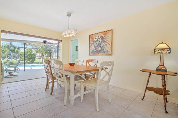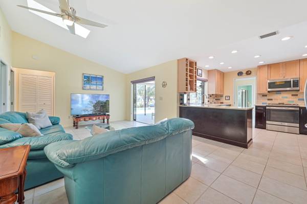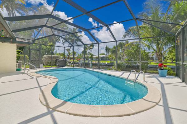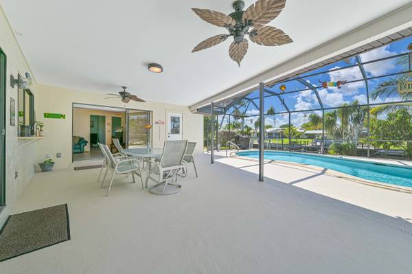 Paradise awaits with this Gulf Access Pool Home 10 minutes wake speed to open river. NO FLOOD INSURANCE, home is NOT located in a Flood Zone nor has it ever been flooded. This beautifully landscaped 3 bedroom, 2 bath has been completely renovated Pre-Ian to perfection offering 1,852 sq. ft. of contemporary and elegant ambiance with stunning water views from most every room. New roof with skylights that give that light bright and airy feeling. The wall of hideaway recessing patio doors makes the home open light & bright. Completely and elegantly tiled throughout. Large indoor laundry room with large pantry. Full house water purifier. Beautifully updated chefs delight kitchen Quartz counter tops, soft close cabinets with pullouts, stainless steel appliances with pass-thru window to very large screened no bugs patio with gorgeous sunset and water view. Spacious master bedroom his and hers closets with slider to lanai and pool area. Both bathrooms have Quartz counters, soft close doors and tile inlaid walls. Double Front Doors and master bedroom windows are Impact. Boaters paradise with 10K boat lift, captains walk and Extra Large Lanai. Avocado, banana, coconut and mango trees. Freshly screened no bugs pool cage. Two recently new AC units still under warranty that divide the home in two sections for year round comfort and energy efficiency. Walk to vibrant Farmers Market and Downtown entertainment area. Fenced pet friendly back yard. Best location to get to all amenities without traffic. Safe secure established neighborhood with awesome neighbors. This property is a secure investment in a boater's paradise and premium location.