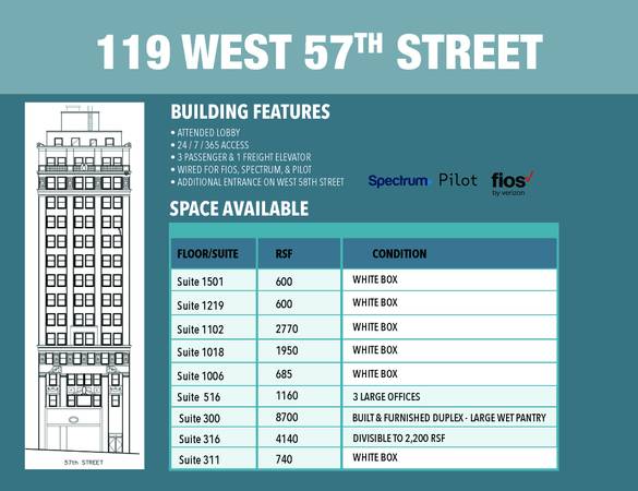 Office For Rent - Steps to Central Park 600sf , 1000sf, 1950sf available Brand New Offices Brand New HVAC system. Brand New Pantry 24 / 7 Access Brand new renovated lobby. Oversized Freight Elevator...