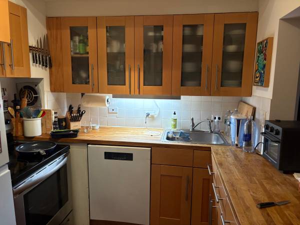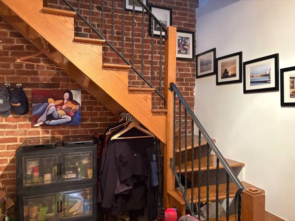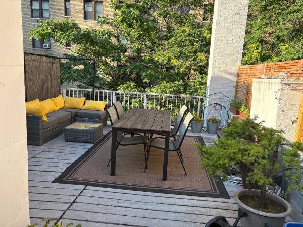 Shared space: sunken living room, big open kitchen with dishwasher and huge bathroom with skylight. Washer and dryer. Huge private roof terrace. 3 flr walk up.