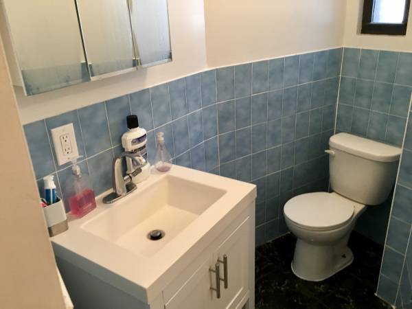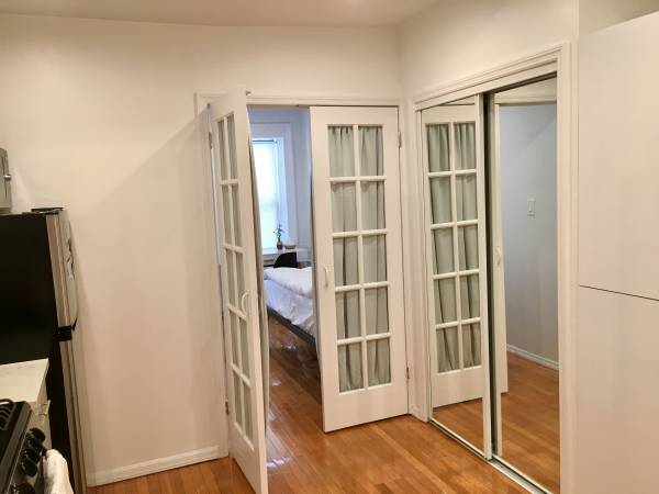 The only drawback is it's on the fifth floor, and it has a railroad-style layout for access to the bathroom. To be clear, the layout of the apartment is My Bedroom > Kitchen/Dining > Your Bedroom > Bathroom.