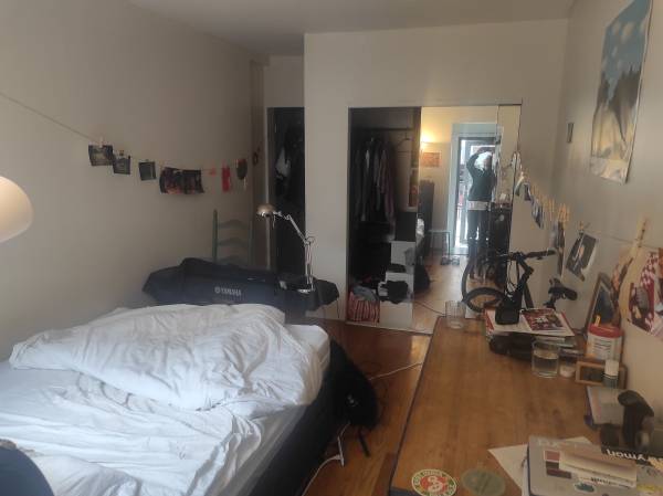 It's partly furnished (bed, matress, huge wardrobe, desk).