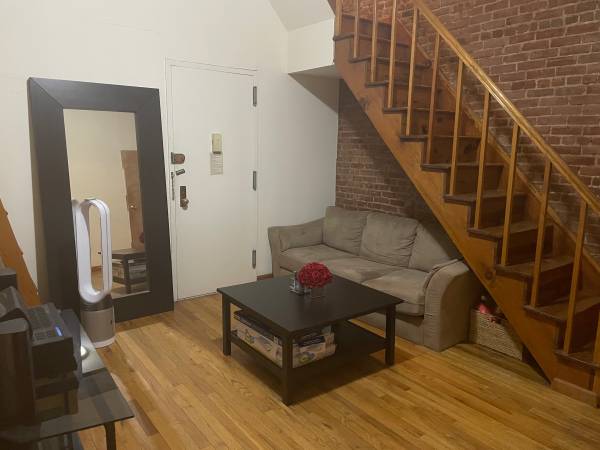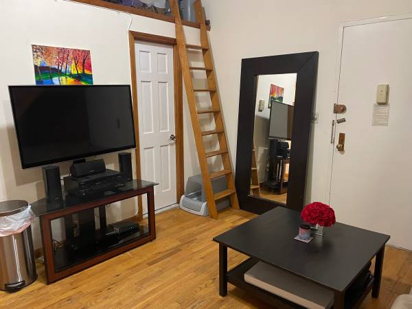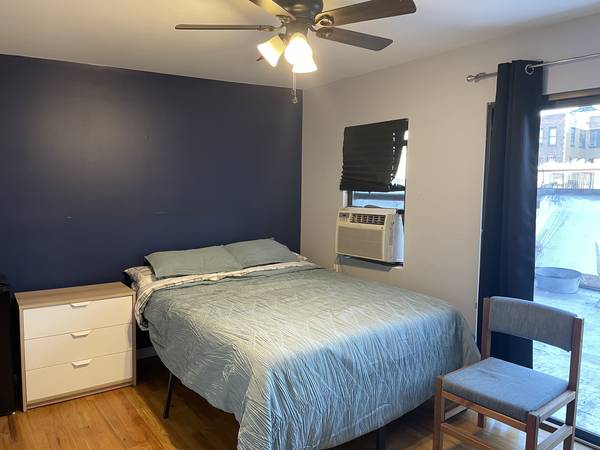 Spacious bedroom with a private bathroom and a private outdoor patio available in a UWS duplex. The apartment is located just above Lincoln Center and is just steps from an entrance to Central Park. Also very close are the B, C subway stop and the 1, 2, 3 subway stop. The bedroom is furnished with a bed, ac, dresser, chair, shelves and mini fridge.