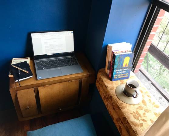 The room I am renting out is comfortable, well-kept, and private with shared facilities and mini-chef's kitchen in a loft-like live/work writer's apartment in a classic prewar Manhattan walkup situated amid the vibrant UWS Morningside Heights neighborhood near Central Park. The room has been described by previous guests as “Zen Victorian,” with its relaxing deep-blue walls, soothing natural light, and treetop-and-sunset view.