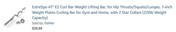 47" EZ Curl Bar Weight Lifting Bar for 1" hole weight plates + STAR COLLARS NON-SLIP DIAMOND KNURLS Hardly used and it's for a bar only. Can hold up to 220 lbs. (weight plates are not included)...