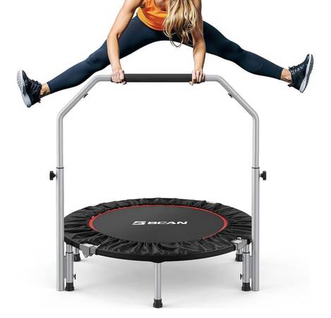 BCAN Mini Trampoline with black and red design. 4 Level adjustable bar was never attached. It was purchased on Amazon on 8/12/24 and was barely used. It can be folded down for easy storage after removing handle and legs. Fun for the whole family. Happy jumping!!