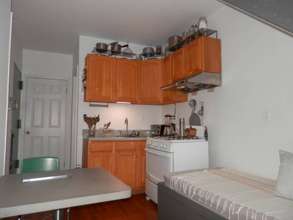 Fully furnished, equipped kitchenette, oven works, plus toaster oven, no microwave. No washing machine but various laundromats around the block.