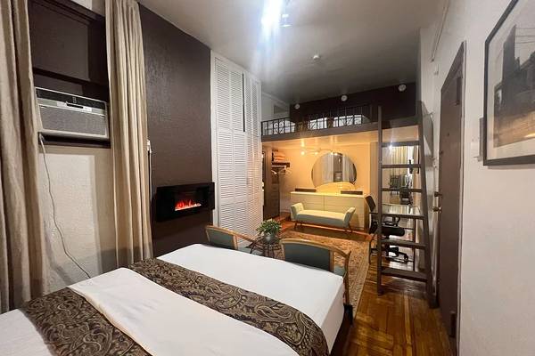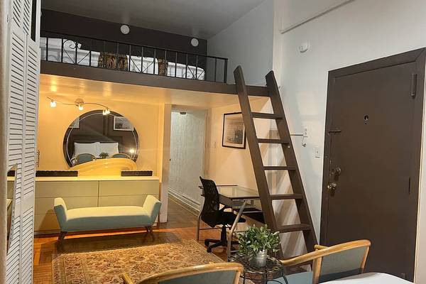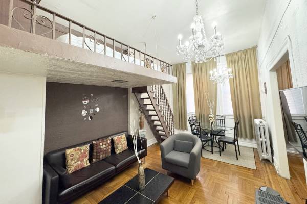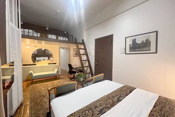 This rare and elegant East Village gem is a stunning, oversized one-bedroom apartment with one and a half bathrooms and two additional sleeping lofts. Featuring soaring cathedral ceilings, abundant natural light, and spacious living areas, it sits in a beautifully renovated brownstone with elevator access—a rarity downtown.