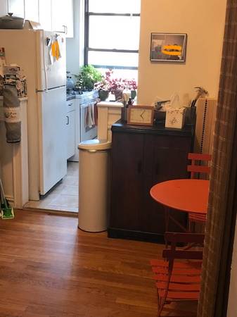 Furnished bright bedroom with a private half bath in spacious 2-bedroom apartment in Hudson Heights. There is an eat-in kitchen. Preferred renter would work or study outside at least part time, as I work in the living room. I am a writer and would like a well-mannered, discreet person who respects my privacy. This is a quiet, tree-lined street. Fort Tryon Park is a 10 minute walk away.