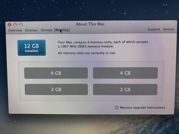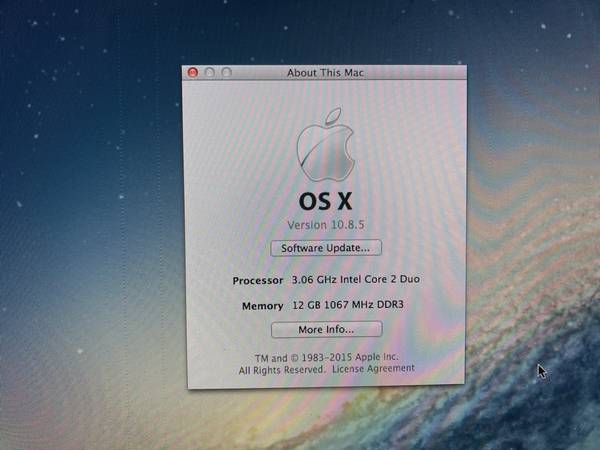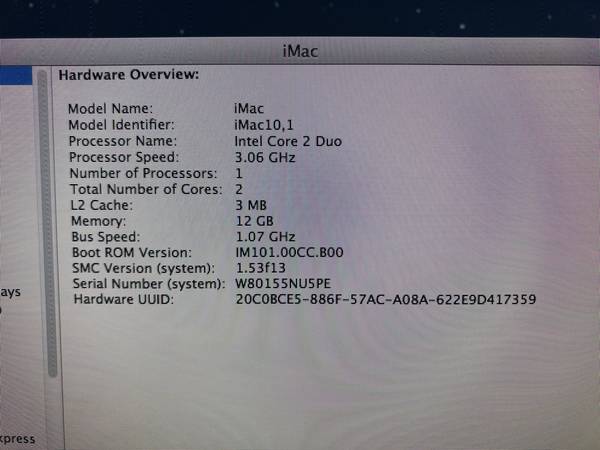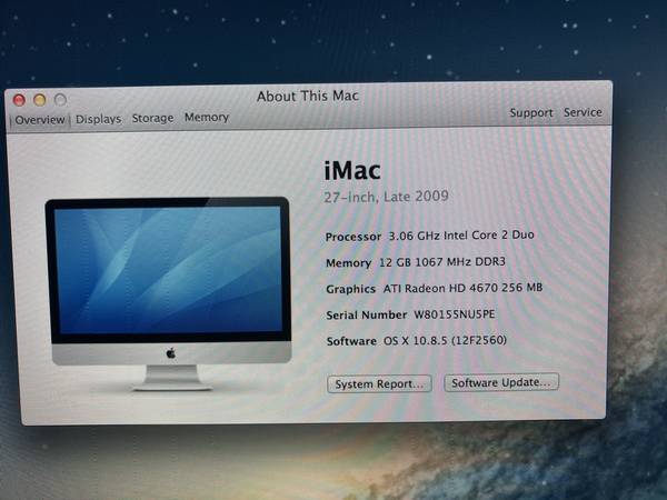 Apple iMac 27" Desktop (late, 2009) - 3.0 Ghz Intel Core2Duo, 12 GB RAM OS10.8.5... Yes I am old - but I am wise and still useful. The CD burner alone is worth the price. Please save this indestructable and quite versitile machine from the landfill. Inspiring Buddhist mantra and 10-century poetry included, no extra charge. (Or I'll clean them and the glue off, if you prefer.) See photos for input port scratches and a gouge on the back of the case, and one big DING on the glass screen RH side.Height: 20.4 inches (51.7 cm)Width: 25.6 inches (65.0 cm)Depth: 8.15 inches (20.7 cm)Weight: 30.5 pounds (13.8 kg)1Connections and expansionOne FireWire 800 port; 7 wattsFour USB 2.0 portsSD card slotBuilt-in AirPort Extreme 802.11n Wi-Fi wireless networking;2 IEEE 802.11a/b/g compatibleBilt-in Bluetooth 2.1 + EDR (Enhanced Data Rate)Built-in 10/100/1000BASE-T Gigabit Ethernet (RJ-45 connector)Built-in stereo speakersTwo internal 17-watt high-efficiency amplifiersHeadphone/optical digital audio output (minijack)Audio line in/optical digital audio input (minijack)Built-in microphoneMeets ENERGY STAR 5.0 requirementsRated EPEAT Gold