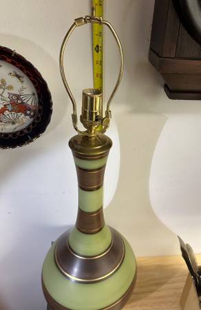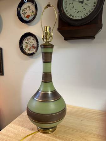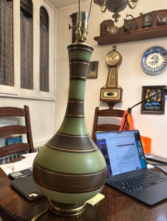 This is a wonderful stylish modern lamp. The style is mid-century but I don't believe it is that old. Very cool design. Great shape. Works fine. Approx. 27" tall. To be honest, I'm not really sure what makes a lamp a "ginger" lamp. All I can say is that with the right lampshade this beauty will rock your home! I'm not sure where mom bought this lamp, but the $699 price tag is still on it. A steal at $200, highway robbery at $125! Yours for the price of a cup of coffee! $100!!!