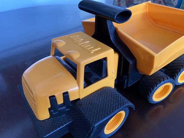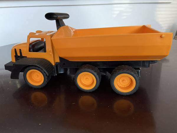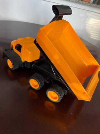 Load the dump bed and dump your payload like the real trucks. Sturdy high quality plastic with real rubber wheels. Approximately 13 inches long and 5 1/4 inches wide. See pictures $20 or best...