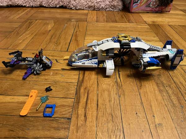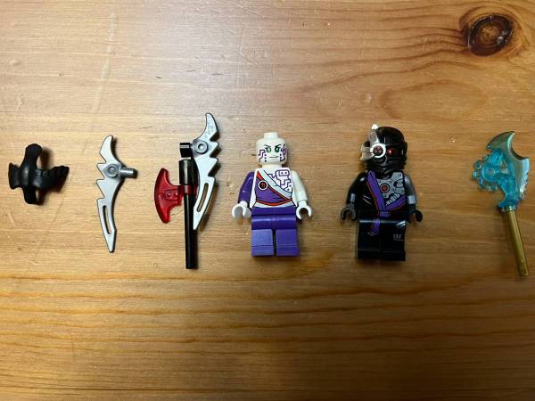 The set has two minifigures with weapons: Pixal (missing hair) and one Nindroid. The set has three pieces missing.