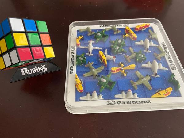 2 challenging 3D puzzles 1. The Original Rubik’s cube 2. 3D airplane squares ( much more difficult than it seems) $20 or best reasonable offer.