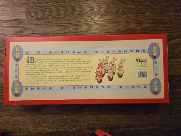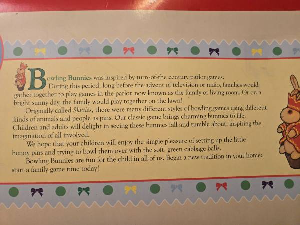 in new condition with original box. Has 6 bunny pins and 2 cabbage balls. (Soft, lightweight) Adorable. For kids 2-5 years old Or collectors