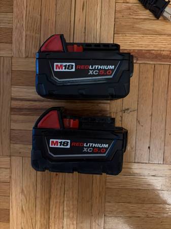 2- Milwaukee M18 red lithium xc5.0 2- Milwaukee M12 M18 chargers