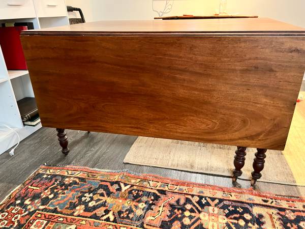 Beautiful 19th century English gateleg writing table with rich mahogany grain and classic turned legs. A timeless piece that works equally well as a writing desk, dining table, or entryway console. $650