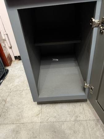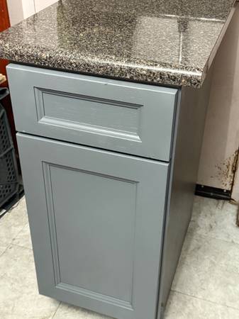 New base cabinet from FOREVER MARKET :Elegant design and kitchen storage, adding a touch of sophistication to your space, smooth opening and closing of the door and drawer making it suitable for long time use without problems and because it is made of original wood inside it has a platform that divides the interior into two floors. The measurements are: the base 15 wide x 25 deep x 34.5 high,,.., the counter top is: 18 wide x 25 deep x 1.5 and 5 high in the low and high areas..the color is gray. It is also designed to be used in the bathroom too. t is the price and in cash.