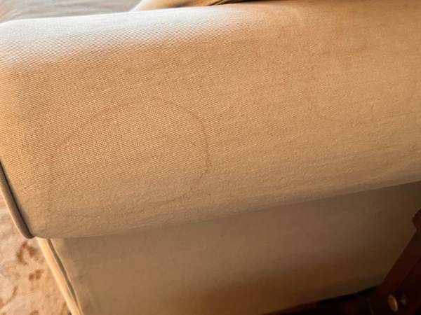 Free green pullout couch. It is worn. There is some fraying of the fabric - most on reverse side of the cushions, but it is beginning on the top side of the cushions also. There are also stains on the fabric. The stains are from spot cleaning the couch over the years - water rings tended to be left behind after cleaning.