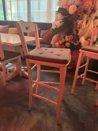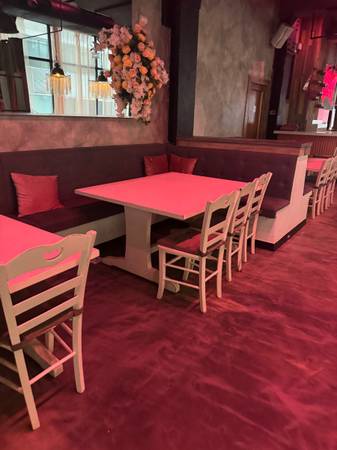 FREE, 64 chairs, 21 barstools and 16 tables. Combination of 8 tops, 6 tops and 2 tops. Must take all,