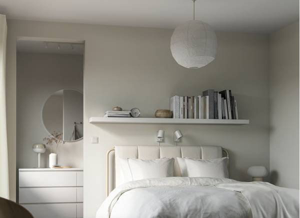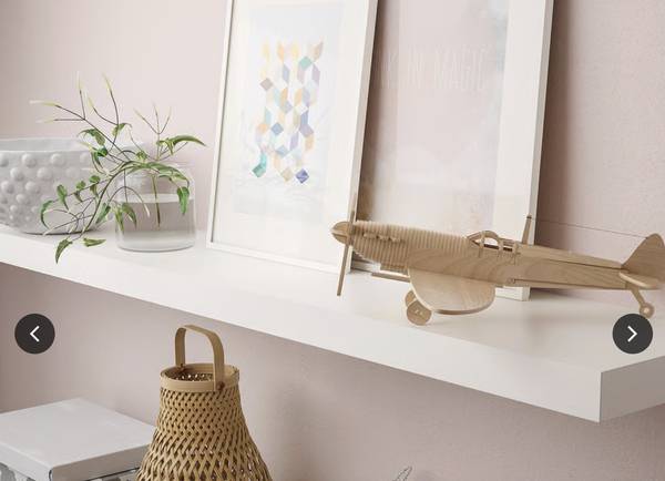 Three floating shelves from Ikea's LACK series. Each one is 74 3/4" x10 1/4 "; 2 inches thick. The color is white-stained oak effect.