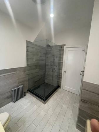 Bathroom includes large glass enclosure shower and oversized bath tub.