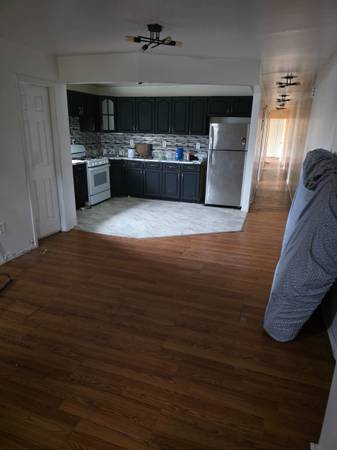 This open-concept layout seamlessly connects a modern kitchen to a cozy living area. The kitchen features high-gloss dark cabinets, stainless steel appliances, and a chic tile backsplash. Transitioning into the living space, you'll find warm wood-style flooring and a hallway leading to private quarters. Perfect for buyers who value flow and functionality in their home design.