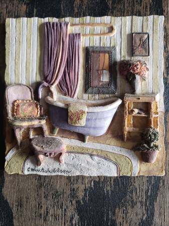 These are 2 vintage 3D artwork reproductions created by C. Winterle Olson in the 1980s. The piece is made of resin and ceramic materials and is wall-mountable with a size of 5.5 x 5.5 inches. The artwork is signed by the artist and depicts a bathroom-related theme.