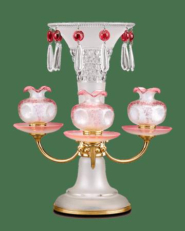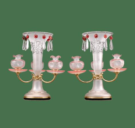 This extraordinary and rare pair of centerpieces beautifully showcase the artistry of Baccarat crystal. Art Nouveau in style, the centerpieces feature large vases of frosted glass with masterfully cut designs at their flared peaks. Teardrop glass accents are elegantly draped from the vases’ rims, adding a delicate sense of movement to the stunning pieces. Three tulip-form shades of shimmering pink art glass are supported by gilded arms that protrude from the vases center in graceful arches, completing the stunning pieces. Exquisitely decorated with an etched floral motif, these centerpieces typify Baccarat’s interpretation of Art Nouveau.
