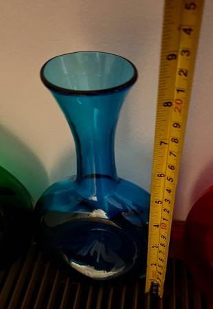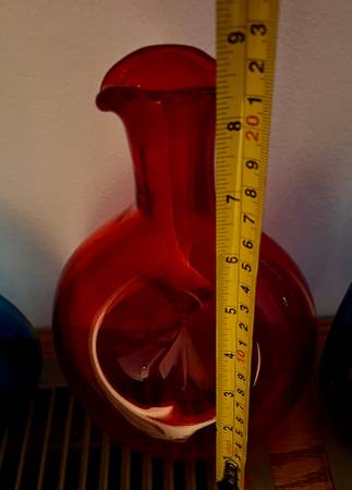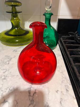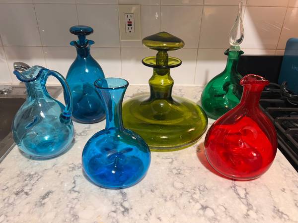 Selling collection of 6 Blenkos. Three have stoppers. One is a pitcher with small chip at lip (detailed photo). All have the pontil mark that Blenkos have. Vibrant colors and one in particular is an unusual shape and quite large. Cash and carry. Have packing paper that these were wrapped in and kept in storage in a large storage bin. You can take the bin with you to carry them. Local pickup only. Mondays/Fridays and weekends are very flexible. Tuesday-Thursdays are evening.