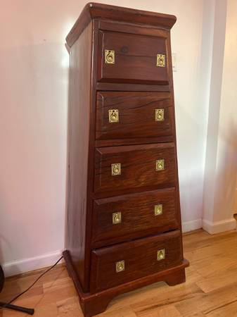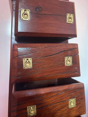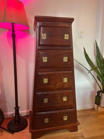 Exquisitely handcrafted from solid African teak, this five-drawer campaign chest features a rare tapered silhouette and original brass hardware. Built entirely without nails or screws, it showcases traditional joinery and masterful craftsmanship. The rich teak grain and architectural form make this a sculptural, collectible statement piece.