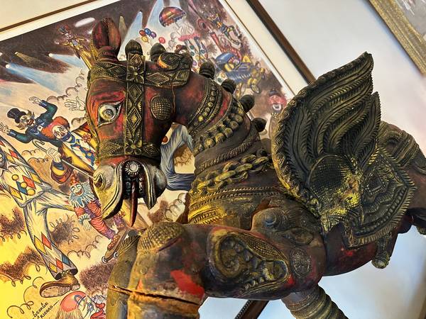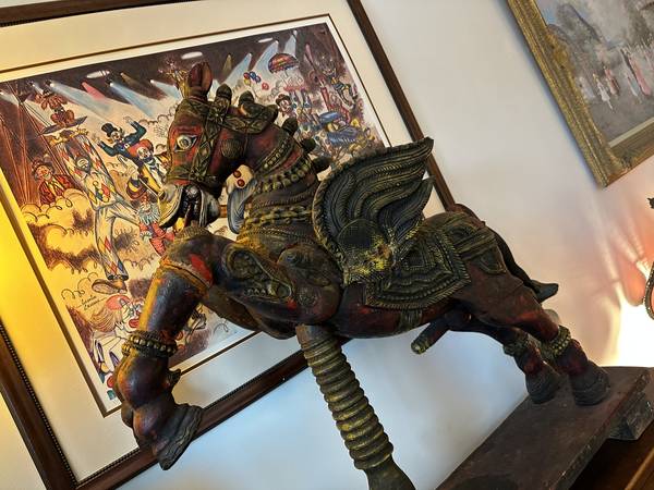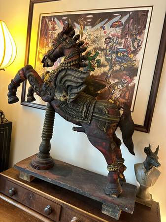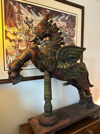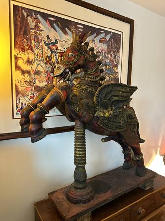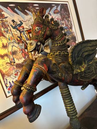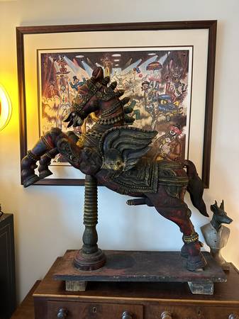 This is a rare beauty. Authentic Indian Temple Horse. We bought it years ago at an estate sale, and it's worth way more than this. Sadly we are moving and it would get damaged. Already needs some love. One of the wings and leg need to be put back into place. We don't have the time or money to invest in the restauration. This can probably sell for $4000 or more in an art gallery.