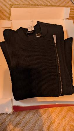 NEVER WORN. tags XS Black sweater with diagonal zipper, fitted cut, bold round neckline with big silver snap.