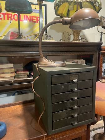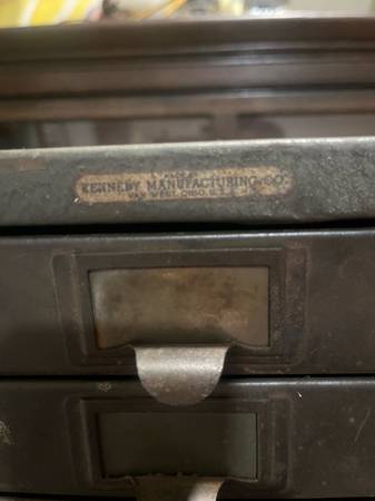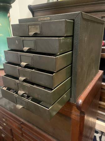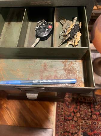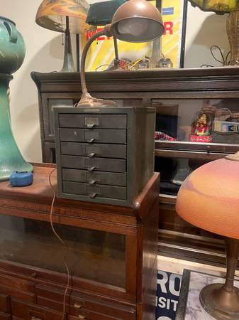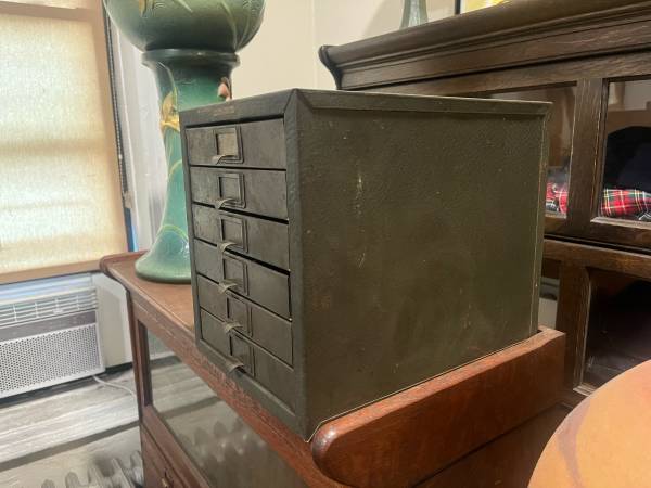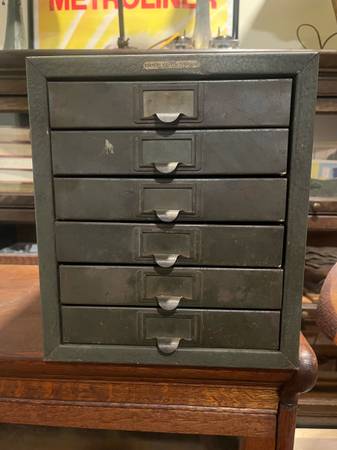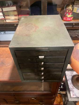 Awesome industrial small filing cabinet. Great for smalls, Jewlery, keys etc. Nice, smaller size. 10 in wide, 11.25 in tall and 13.25 in deep.