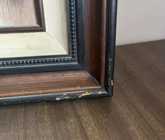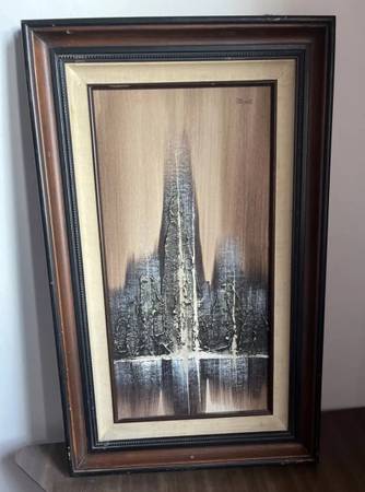 Artistic Interiors signed Mid-Century painting. The painting is raised and has a 3-D appearance in sections. It’s framed by wood, canvas and two more wood frames. The artist signature is Devine.