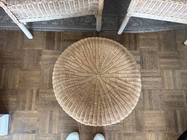 A set of two Armchairs, rattan/bamboo with a small rattan/bamboo ottoman. Made of hand-woven rattan, a living material that makes each armchair unique. It's airy, comfortable to sit in and easy to move around thanks to its low weight. A great way to invite nature into your home.