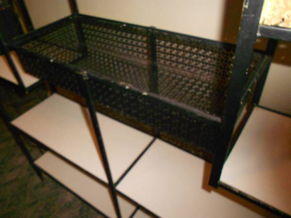 The formica shelves are removable and are a subtle grey line abstract against a white background. Instead of a center shelf, like the few others I have seen, this one has a stamped metal "basket" in the center.