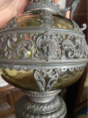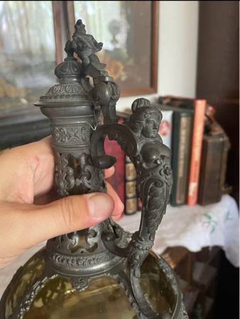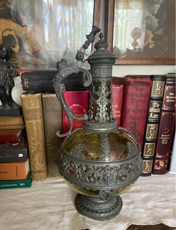 A gorgeous Neo-Renaissance or Renaissance Revival period, possibly from the late 1800s Victorian olive colored glass body decanter encased in elaborate cast pewter or bronze overlays, including a scroll handle, pouring spout, and a raised base.