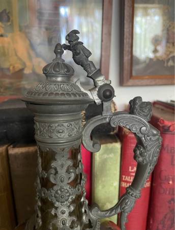 Decorated with gargoyles faces on its body, a woman on its handle and a man with his cup on the top.