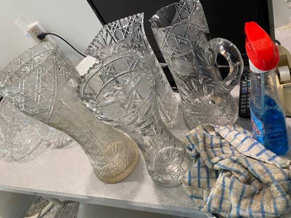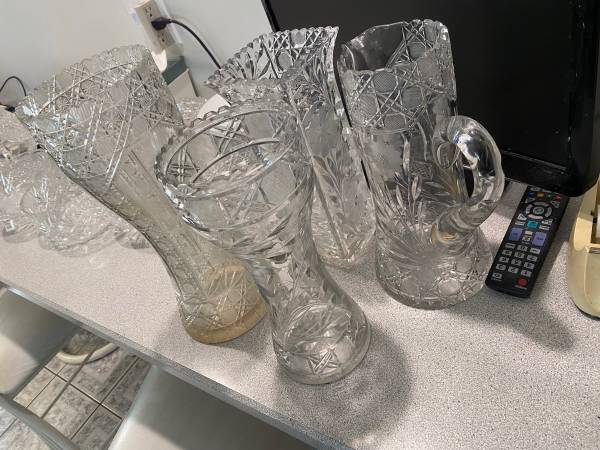 An assortment of antique Cut glass Vases, bowls, decanters and dishes cut glass from different time periods some items over 100 years old but all in nice condition