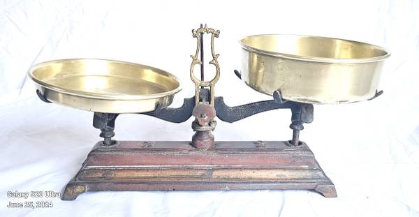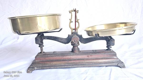 This antique French stile scale is a beautiful addition to any display, whit the original patina most of it . With two shiny brass trays, it exudes a timeless charm that will capture the attention of any passerby. The maker of this scale is unknown, but its unique antique look is sure to impress collectors and vintage enthusiasts alike. Perfect for use in you kitchen, mercantile, trades, or factories, it adds a touch of history and character wherever it's placed. Add this antique scale to your collection today and enjoy its beauty for years to come.